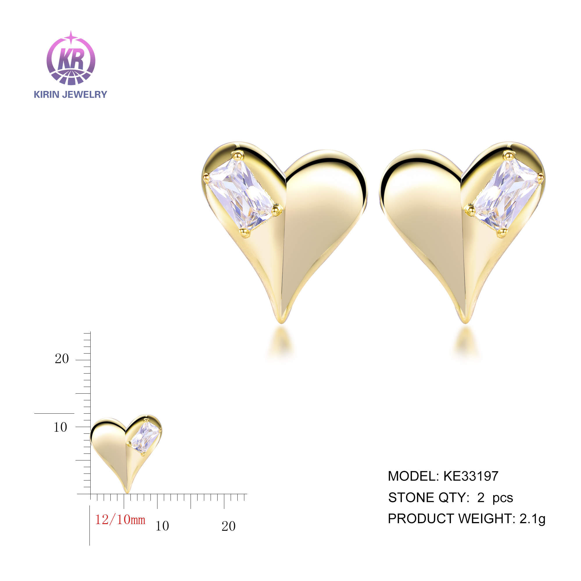 baguette heart earrings with 14K gold plating CZ KE33197