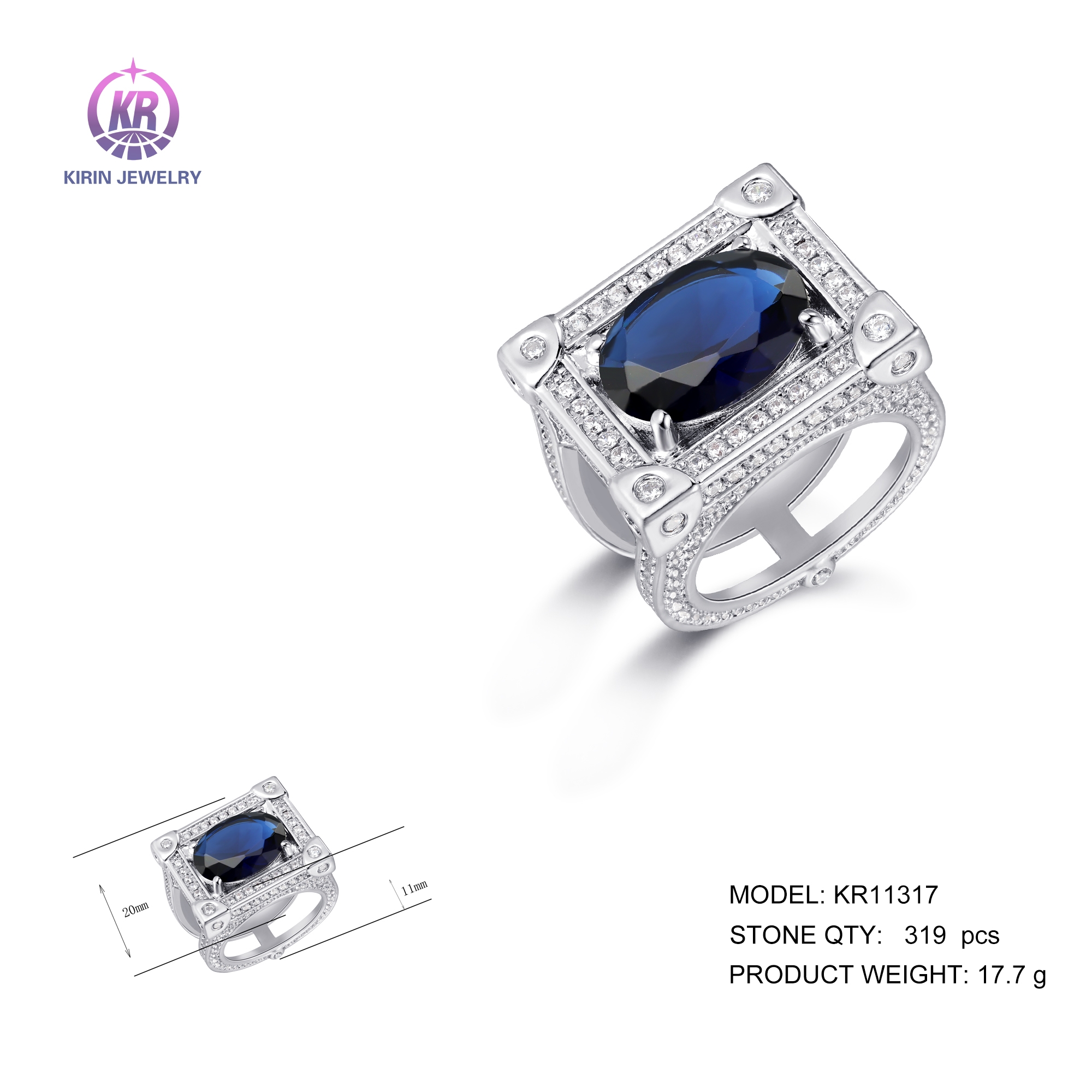 925 Sterling silver ring with rhodium plated dark blue glass cz 11317