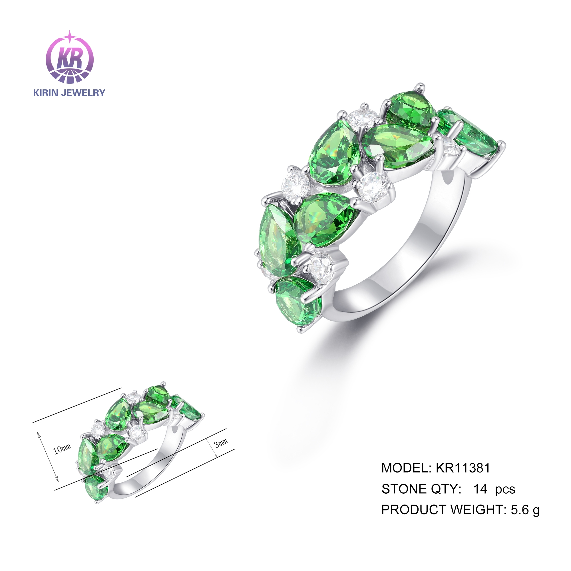 925 Sterling silver ring with rhodium plated green cz 11381