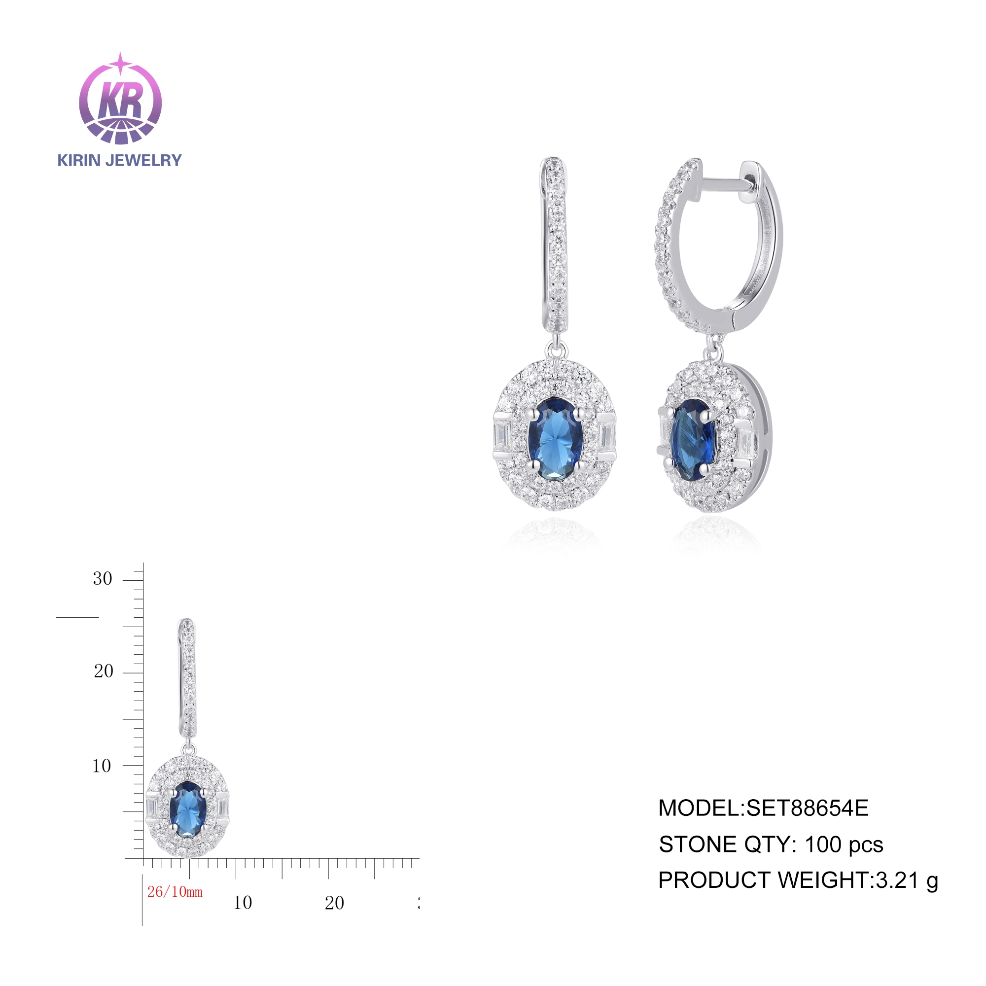 925 Sterling silver earring with rhodium plated dark blue glass cz 88654E