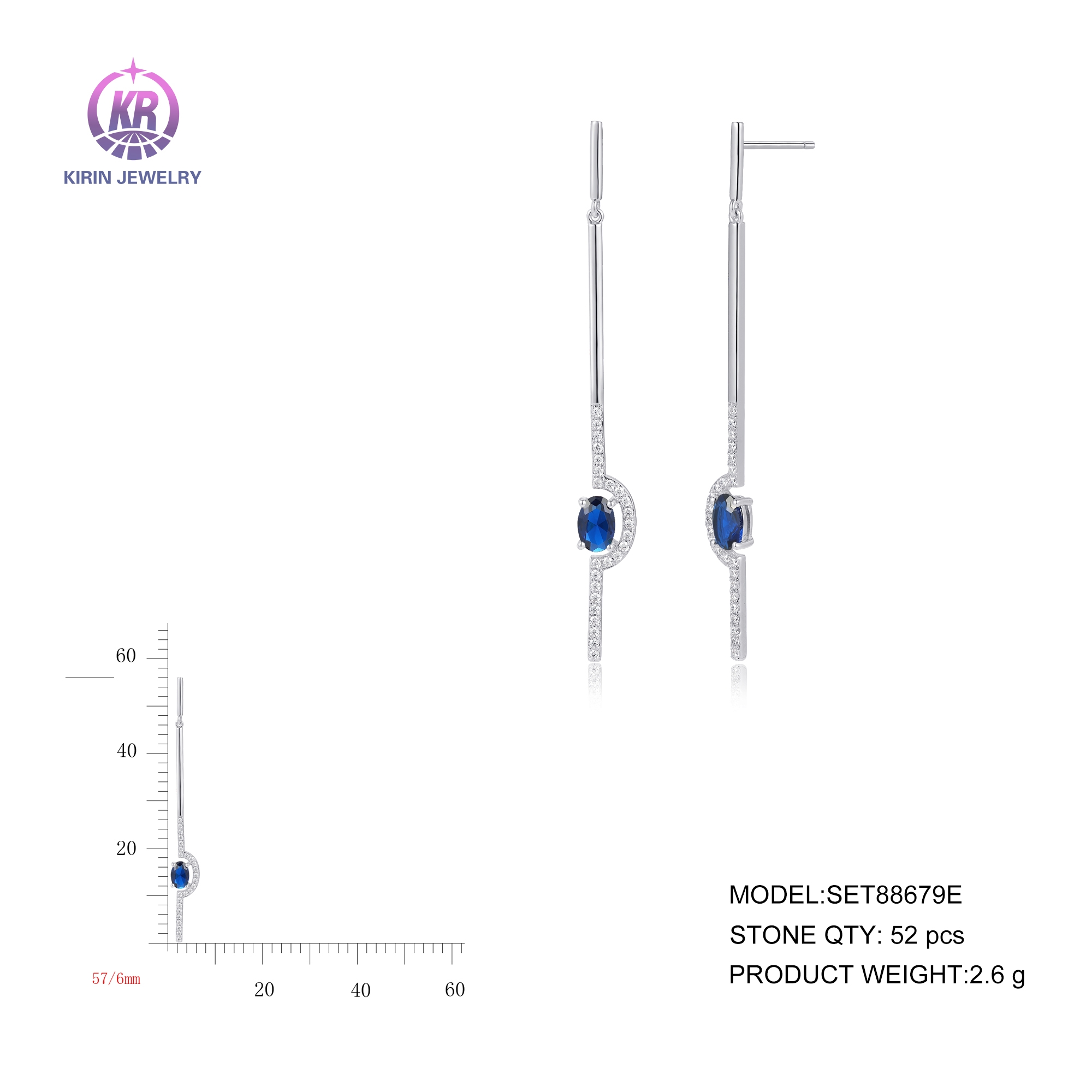 925 Sterling silver long earring with rhodium plated dark blue glass cz 88679E